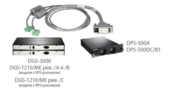 (Для подключения резервного источника DPS-500A или DPS-500DC/B1 к коммутаторам серий DGS-3000-xx, DGS-1210-xx/ME ревизий /A, /B и /С, оснащенных RPS-разъемом)