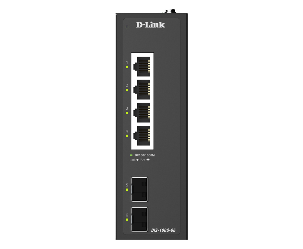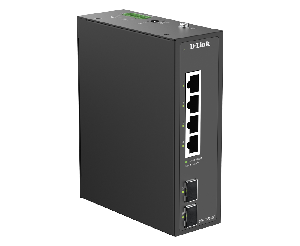 Промышленный коммутатор DIS-100G-06, оснащенный 4 портами 10/100/1000Base-T, а также 2 портами 1000Base-X SFP, которые используются для организации подключения к высокоскоростной магистрали, предназначен для применения в сетях промышленных предприятий.