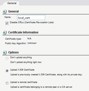 4. Pasirinkite Objects -> Authentication Objects, tada Add -> Certificate. Nurodykite sertifikato pavadinimą Name: local_cert, uždėkite varnelę ant Disable CRLs. Skiltyje Options pažymėkite Upload X.509 Certificate.