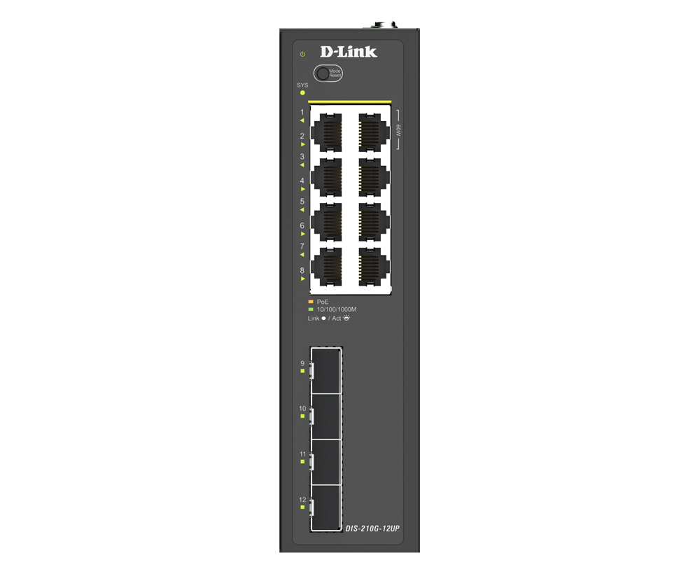 The DIS-210G-12UP Layer 2 Gigabit Industrial Managed Switch is equipped with 6 30 W PoE-capable 10/100/1000Base-T ports, 2 60 W PoE-capable 10/100/1000BASE-T ports and 4 SFP ports. This switch features a robust design making it ideal for deployment in industrial and outdoor cabinet surveillance settings, capable of withstanding the harshest environments. The DIS-210G-12UP switch furthermore integrates advanced management and security functions to provide a complete industrial networking solution.