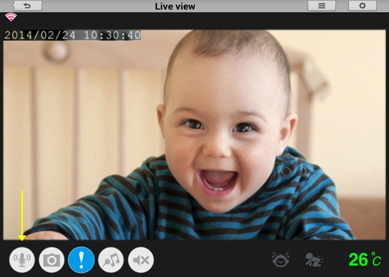 Шаг 3: Нажмите кнопку микрофона слева в нижней части экрана Live View. Теперь можно говорить в микрофон смартфона или планшета, и звук будет воспроизводиться в динамике камеры.