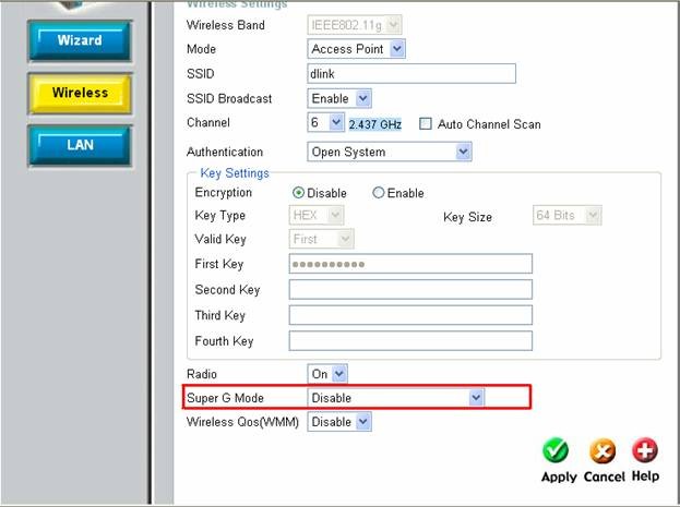 В заводский настройках , в точках доступа DWL-2100AP, режим Super G mode (108 м/b) отключен.