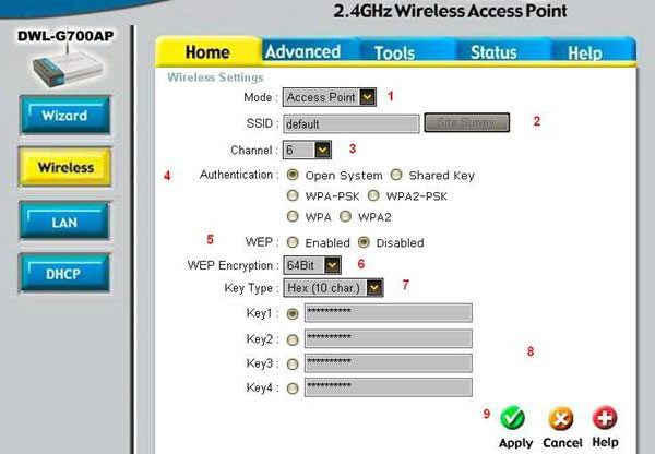 8. Поля для ввода ключей WEP. Точка напротив поля указывает какой именно ключ будет использоваться.