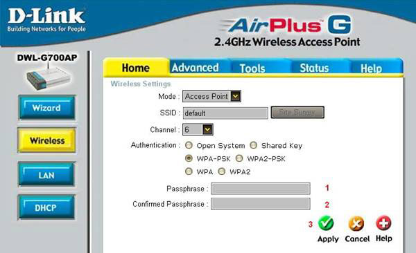 4. Аутентификация. Здесь Вы выбираете режим защиты вашей беспроводной сети. Рекомендуемые значения WPA-PSK или WPA2-PSK в зависимости от того, какую именно шифрацию способен поддерживать ваш беспроводной адаптер.