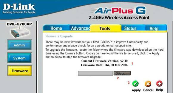 2. При необходимости обновить прошивку, заходите на адрес ftp.dlink.ru и скачиваете новую версию. Далее нажимаете кнопу «обзор» и указываете путь к тому месту, где у Вас на жестком диске сохранена новая версия прошивки.