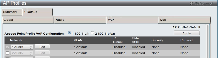 Выбираем вкладку, соответствующую профилю (Default в этом примере), далее VAP: