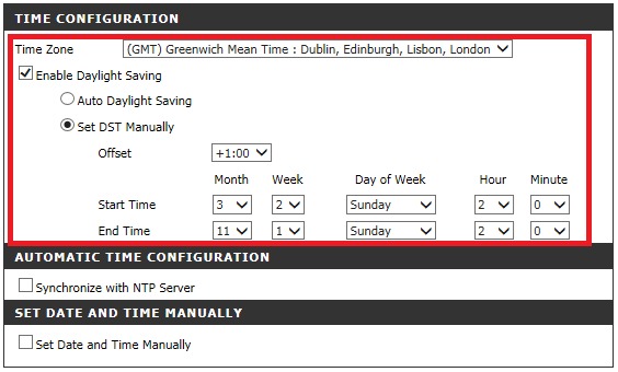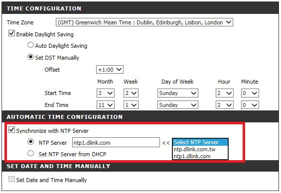 Вы можете выбрать синхронизацию с одним из предложенных NTP-серверов или по DHCP.