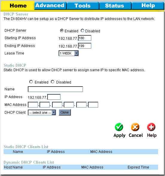 Для настройки DHCP сервера перейдите на страницу Home > DHCP. Чтобы включить DHCP сервер выберете DHCP Server – Enabled. Далее укажите диапазон выдаваемых