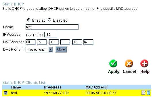Состояние создаваемого правила – Enabled. Имя правила Name выбирается произвольно пользователем. IP Address – IP-адрес выдаваемый компьютеру. В поле MAC Address введите MAC адрес компьютера, которому DHCP сервер будет выдавать определенный Вами IP-адрес. MAC адрес сетевого адаптера в ОС Windows можно посмотреть выполнив в командной строке DOS команду ipconfig /all . Нажмите Apply.