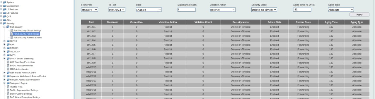 1. В меню слева выберите Security → Port Security → Port Security Port Settings и укажите диапазон портов, для которых необходимо активировать функционал PortSecurity, выбрав соответствующие значения в полях FromPort и ToPort (в примере порты 1/0/1 – 1/0/24).