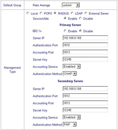 Задаём DSA-3100 внешний и внутренний IP адреса, далее заходим в HOME-->UserManager-->ManagementType-->RADIUS, где задаём IP адрес сервера RADIUS и другие необходимые атрибуты, как это показано на скриншоте.
