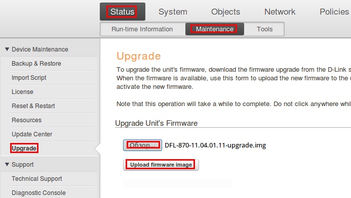 Авторизируйтесь на веб интерфейсе, пройдите Status → Maintenance → Upgrade, нажмите кнопку Обзор (Browse), укажите файл прошивки и нажмите Upload firmware image.