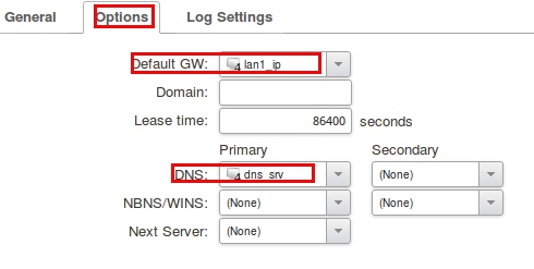 add DHCPServer lan1_dhcp Interface=lan1 IPAddressPool=dhcp_pool DNS1=dns_srv DefaultGateway=InterfaceAddresses/lan1_ip Netmask=subnet_mask