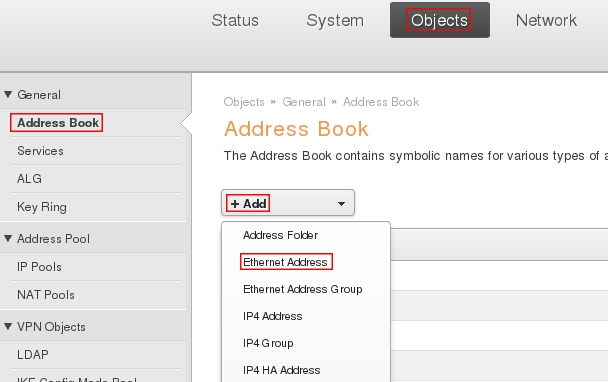 Пройдите Objects → Address Book, нажмите кнопку Add и из выпадающего меню выберите Ethernet Address.