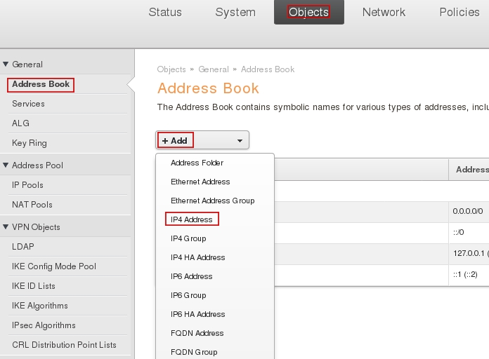 Пройдите в web интерфейсе Objects → Address Book и нажмите кнопку Add, из выпадающего меню выберите IP4 Address.