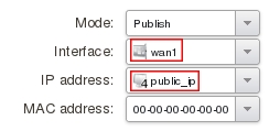 Для начала настройки необходимо создать объекты описывающие публичный дополнительный IP адрес, который будет опубликован на WAN1 интерфейсе и приватный IP адрес на который будет перенаправляться трафик.