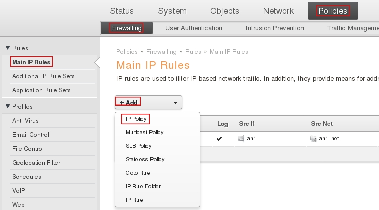 Пройдите в web интерфейсе Policies → Firewalling → Main IP Rules, нажмите кнопку Add и выберите из выпадающего меню IP Policy.