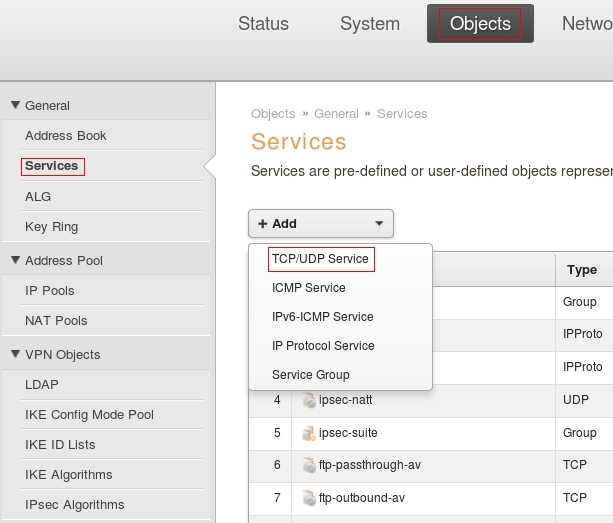 Пройдите в веб интерфейсе Objects → Services, нажмите кнопку add, из выпадающего меню выберите TCP/UDP Service