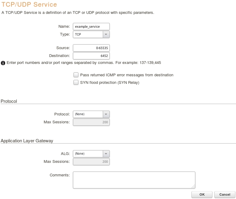 В поле Name укажите название сервиса (примере example_service), из выпадающего меню Type выберите TCP, в поле Destination укажите необходимый порт (примере 6452). нажмите кнопку ОК. Пример заполненных форм вы можете увидеть на скриншоте ниже: