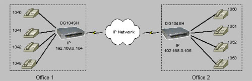 Диаграмма тестовой сети: абоненту с номером "1040", находящемуся в Office 1, необходимо позвонить абоненту с номером "1050", находящемуся в Office 2. Абонент с номером "1040", набирает на своем телефоне префикс выхода на DG104SH (IP 192.168.0.105) например, 9 и внутренний номер абонента -"1050".