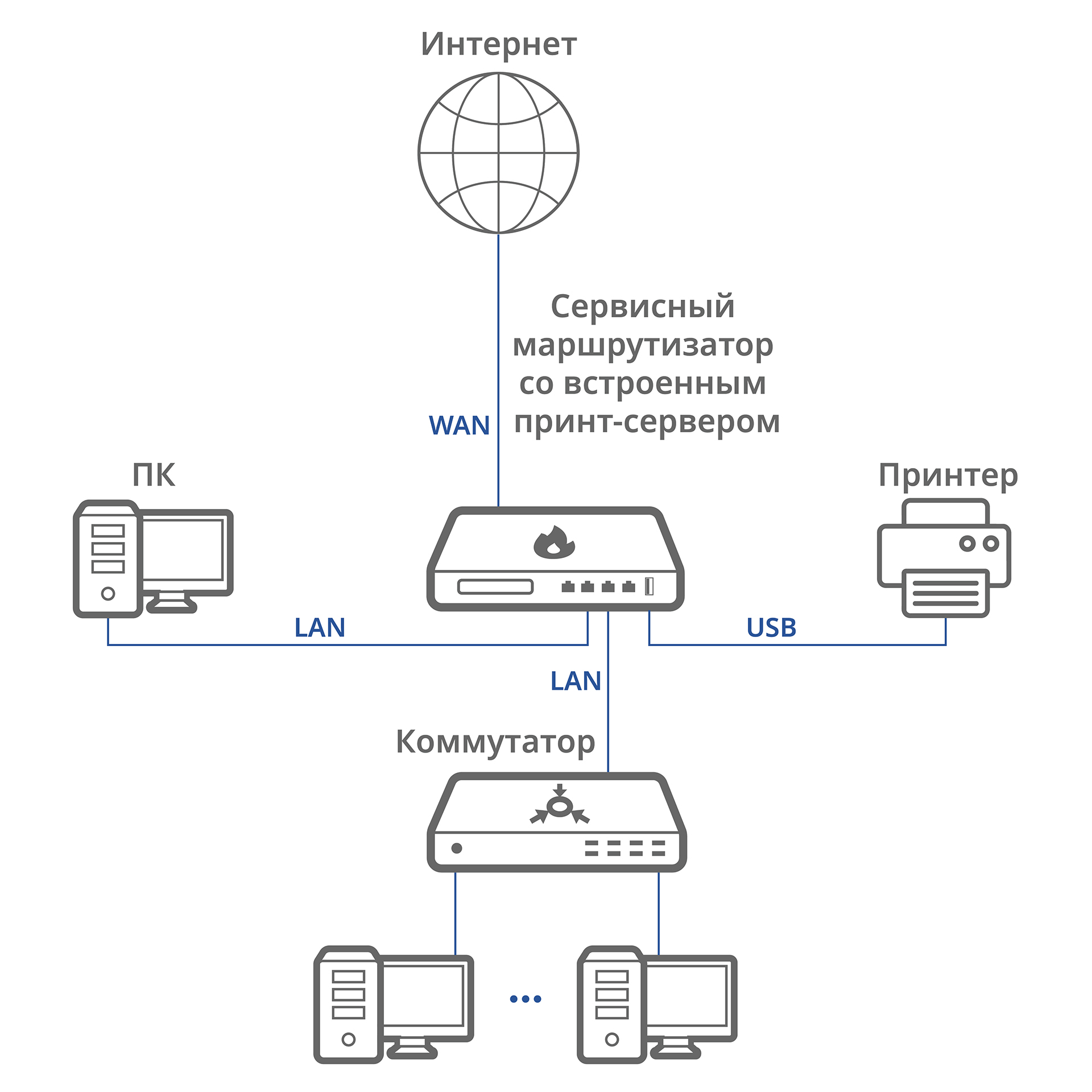 Сетевая печать в корпоративной среде обеспечивает централизованный доступ к принтеру с любых рабочих станций через локальную сеть офиса или предприятия. Для организации печати применяют различные схемы подключения принтеров. Одним из вариантов является использование маршрутизатора со встроенным принт‑сервером – это экономичное и простое в развертывании решение, особенно актуальное в подразделениях, где не требуется сложная система учета и мониторинга печати.