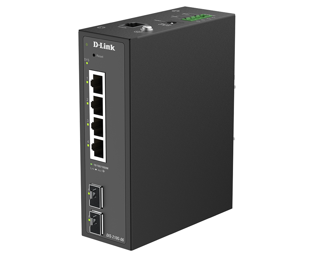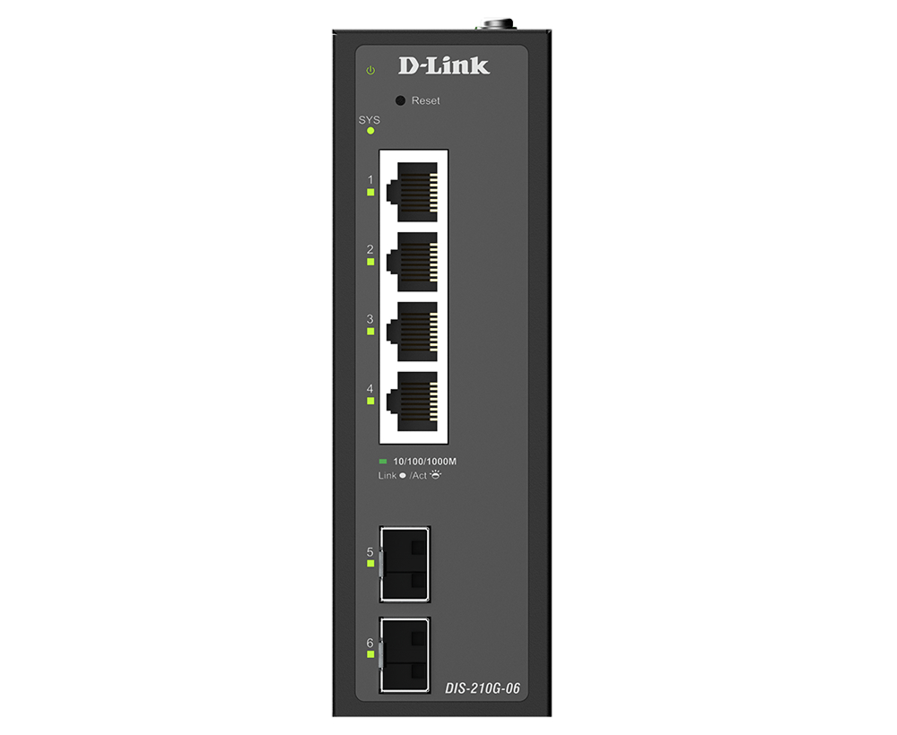 Промышленный управляемый L2 коммутатор DIS-210G-06, оснащенный 4 портами 10/100/1000Base-T, а также 2 портами 1000Base-X SFP, которые используются для организации подключения к высокоскоростной магистрали, предназначен для применения в сетях промышленных предприятий. DIS-210G-06 поддерживает расширенные функции управления и безопасности. Функции управления включают SNMP, управление на основе Web-интерфейса и интерфейс командной строки (CLI).