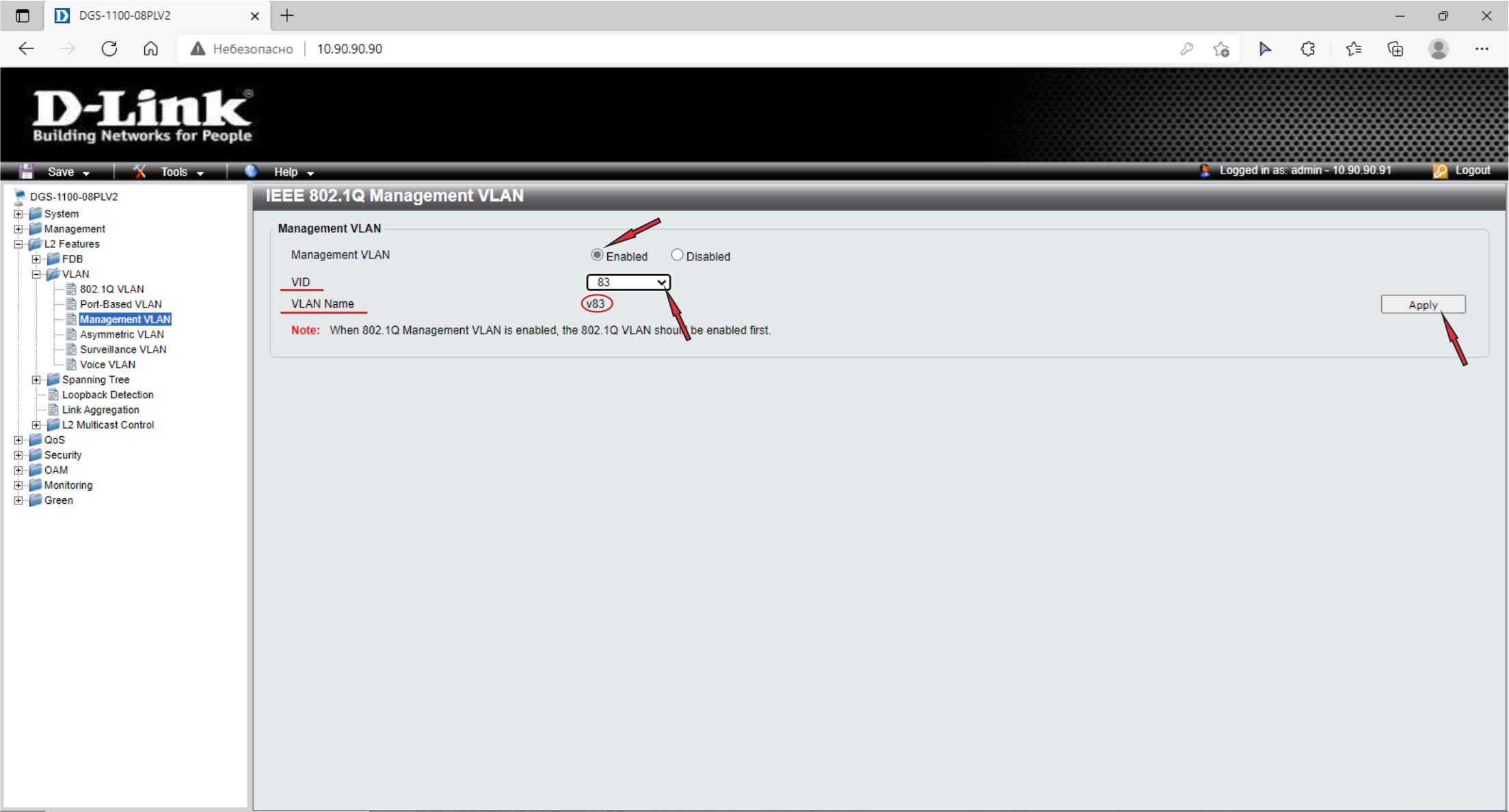 4. Назначьте управляющую VLAN (Management VLAN). Для этого в меню слева выберите L2 Features –> VLAN –> Management VLAN. Активируйте функцию, нажав радиокнопку Enabled. Выберите в выпадающем списке VID значение 83. В поле VLAN Name отобразится имя VLAN v83. Нажмите Apply.