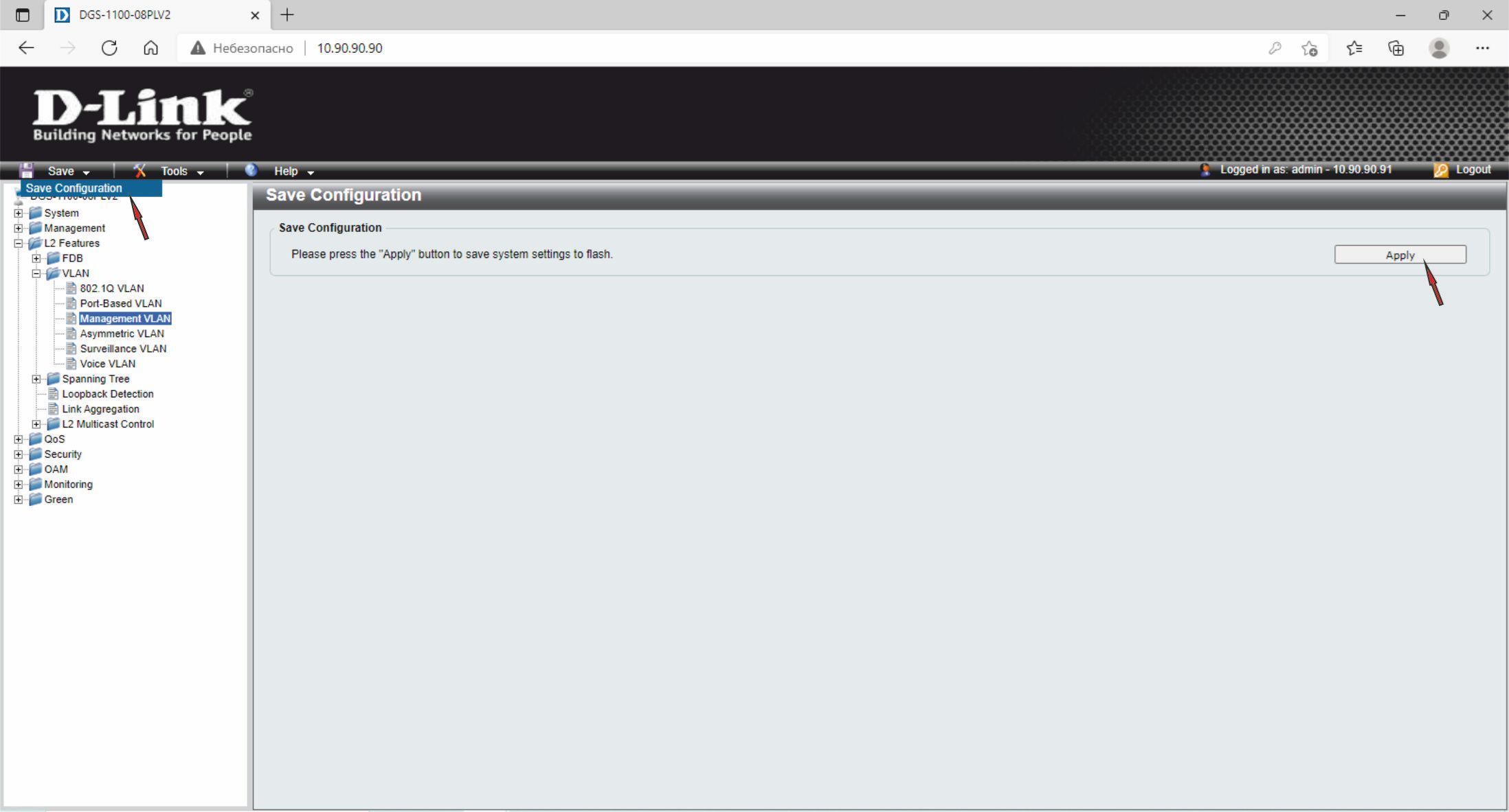 5. Сохраните настройки коммутатора, нажав в левом верхнем углу Save –> Save Configuration, а в рабочей области справа – Apply.