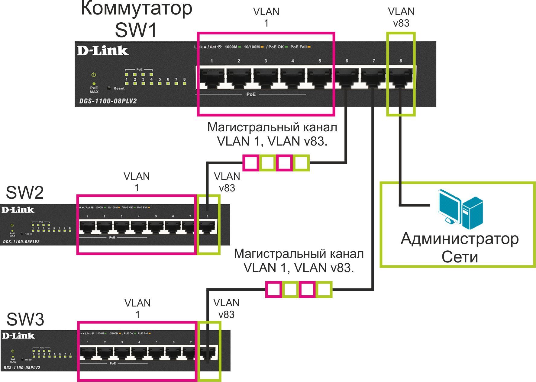 Рассмотрим пример, когда управляемые коммутаторы соединены между собой через магистральные порты.