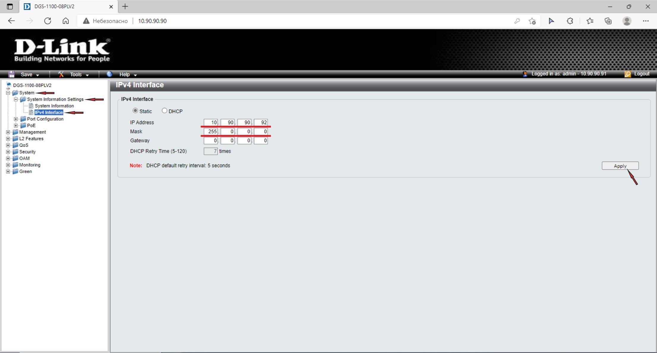 Для этого в меню слева выберите System –> System Information Settings –> IPv4 Interface. Введите IP-адрес и маску подсети, затем нажмите – Apply.