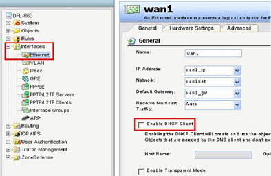 Valige vasakus menüüs Interfaces, seejärel Ethernet, wan1, eemaldage linnuke Enable DHCP Client lahtrist ja vajutage ОК.