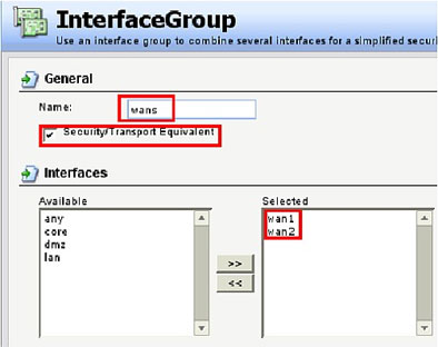 Valige vasakus menüüs Interfaces > Interface Groups. Vajutage nuppu Add, valige InterfaceGroup, väljal Name valige wans nüüd lisage rühma liidesed wan1 ja wan2 nende esiletoomise ja nupuvajutusega >>, pange linnuke valiku Security/Transport Equivalent ette ja vajutage ОK.