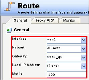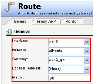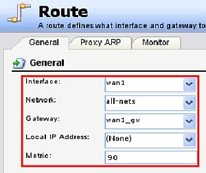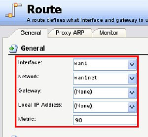 Vajutage nuppu add, valige rippmenüüst Route, väljal Interface: valige wan1, väljal Network: wan1net, meetrika valige 90.