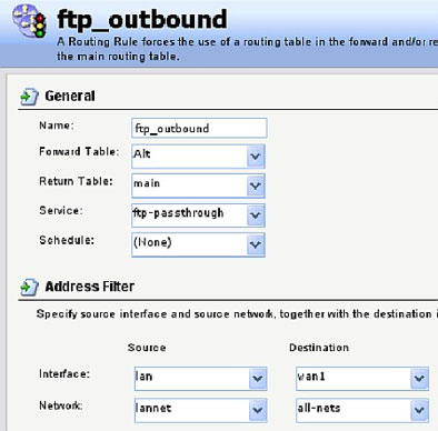 See reegel näitab seadmele, et ftp võrguliiklus (service), mis toimub sisemisest lan-võrgust välisesse võrku läbi esimese teenusepakkuja (wan1), suunatakse marsruutimise alternatiivsesse tabelisse, kus põhilülituseks on wan2 (teine teenusepakkuja). Tulemusena suunatakse kogu ftp võrguliiklus läbi teise teenusepakkuja. Teise teenusepakkuja mitteligipääsetavuse korral käivitub teine marsruut alternatiivses tabelis ja ftp võrguliiklus toimub läbi esimese teenusepakkuja