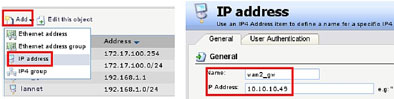 Vajutage nuppule add, valige IP addresses menüüs, väljale Name sisestage wan2_gw, väljale IP addresses 10.10.10.49, seejärel vajutage ОК.