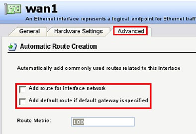 Valige vasakus manüüs Interfaces > Ethernet > wan1, liikuge vahelehele Advanced, eemaldage linnuke Add route for interface network lahtrist ja Add default route if default gateway is specified lahtrist, vajutage OК.