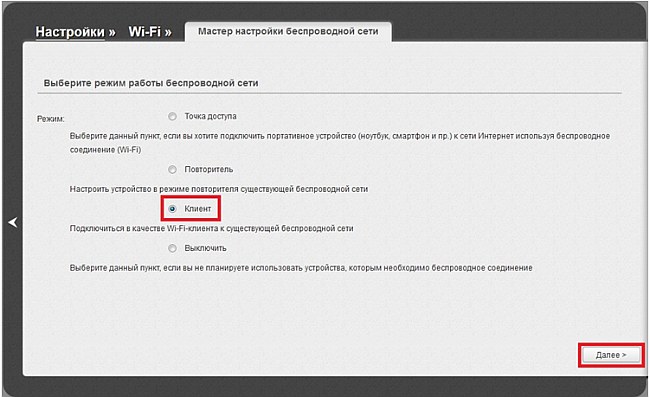 В появившемся окне выберете режим «Клиент» и кликните Далее.