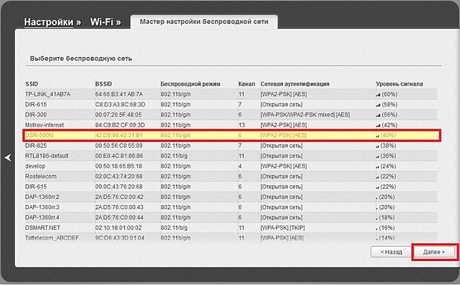 В следующем окне будет отображаться список доступных для подключения беспроводных сетей, среди которых нужно выбрать вашу сеть и после этого нажать Далее.