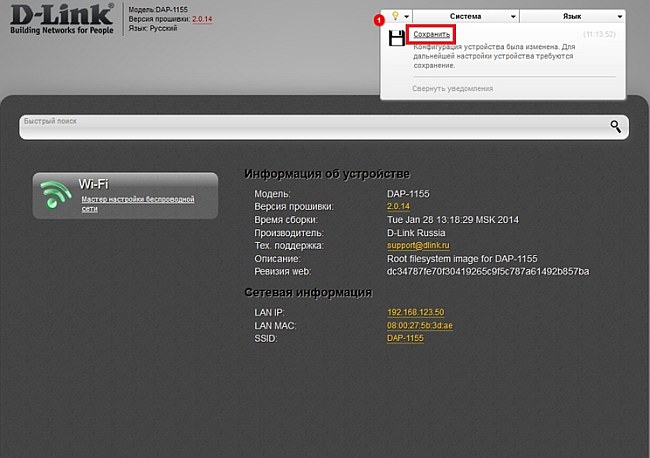 После этого вас перенаправит на главную страницу, где необходимо сохранить конфигурацию устройства, нажав Сохранить.
