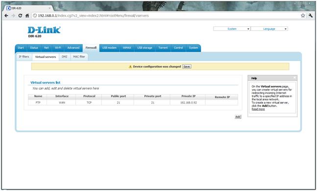 Arba pasirinkite Firewall >> Virtuall servers ir spauskite Add.