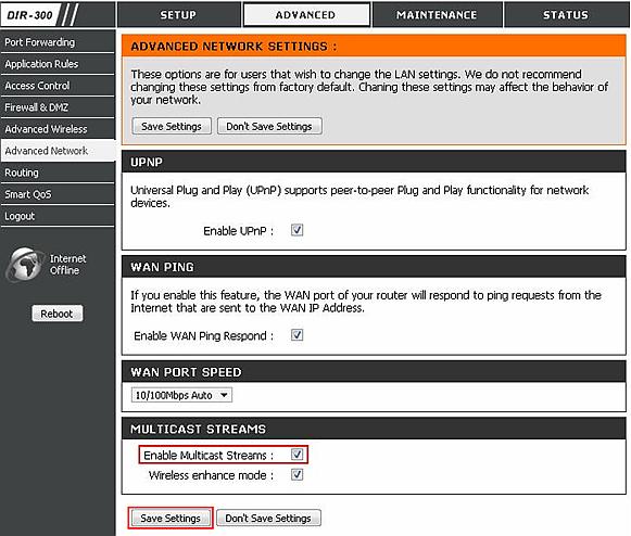 Maršrutizatoriuose DIR-100, DIR-120, DIR-300, DIR-300/NRU, DIR-320, DIR-615 (HW: C2, E4), DIR-620(HW: A1, FW: 0.0.3-rc94) ), DIR-628, DIR-655, DIR-685 (HW: A2, FW: 1.00WW) DIR-825 pasirinkite meniu skyrių „Advanced“, tada „Advanced Network“ ir pažymėkite varnelę prie užrašo „Enable Multicast Stream“.