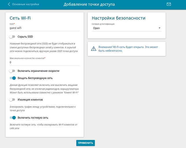 Данный функционал позволяет создать wifi-сеть с ограниченным доступом: клиенты этой сети смогут выходить в интернет, но доступ в локальную сеть маршрутизатора будет закрыт.