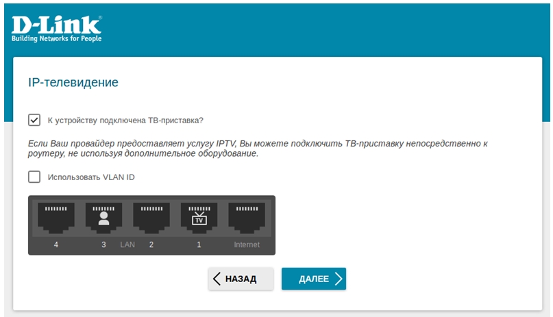 - Если к маршрутизатору подключена ТВ-приставка, установите флажок в соответствующее поле и выберите порт маршрутизатора, к которому она подключена (на примере выбран порт № 1).
