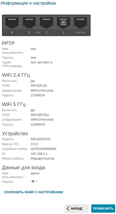 - На следующей странице должно появиться окно с информацией о выполненных настройках. Вы можете сохранить данные настройки в текстовый документ, нажав для этого кнопку Сохранить файл с настройками.