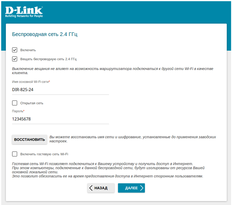 - Аналогично выполняется настройка беспроводной сети для диапазона 5 ГГц. Для перехода к следующему шагу настройки нажмите Далее.