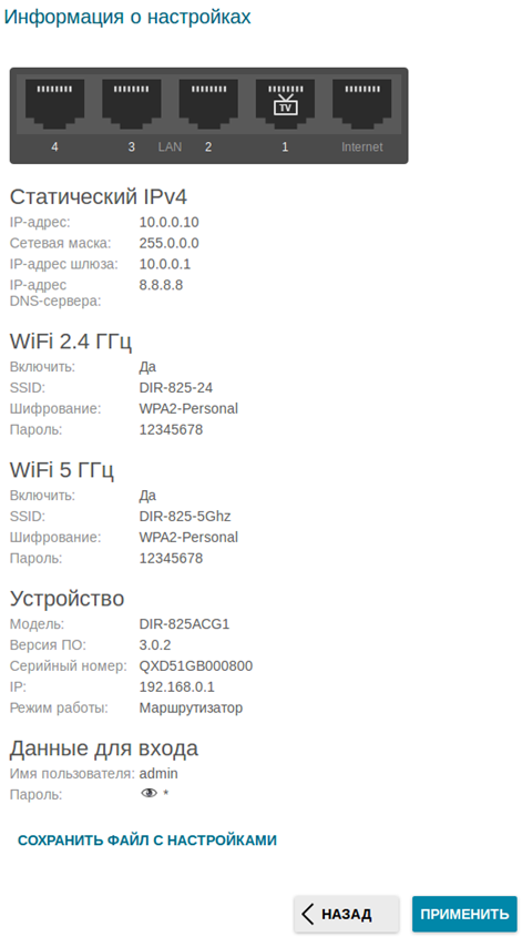 - На следующей странице должно появиться окно с информацией о выполненных настройках. Вы можете сохранить данные настройки в текстовый документ, нажав для этого кнопку Сохранить файл с настройками.