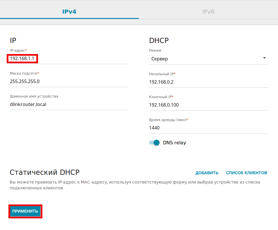 3. На открывшейся странице в поле IP-адрес введите новый IP-адрес и нажмите Применить.