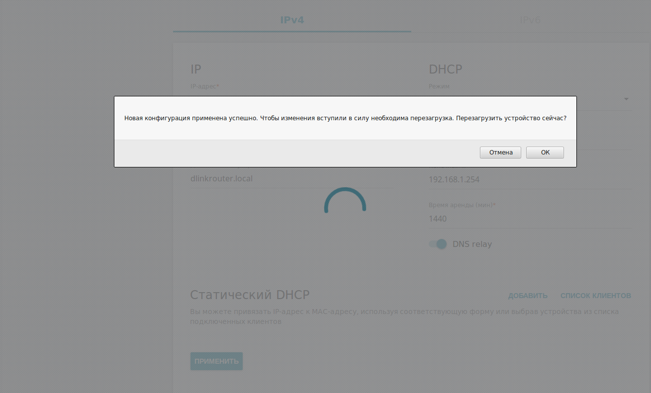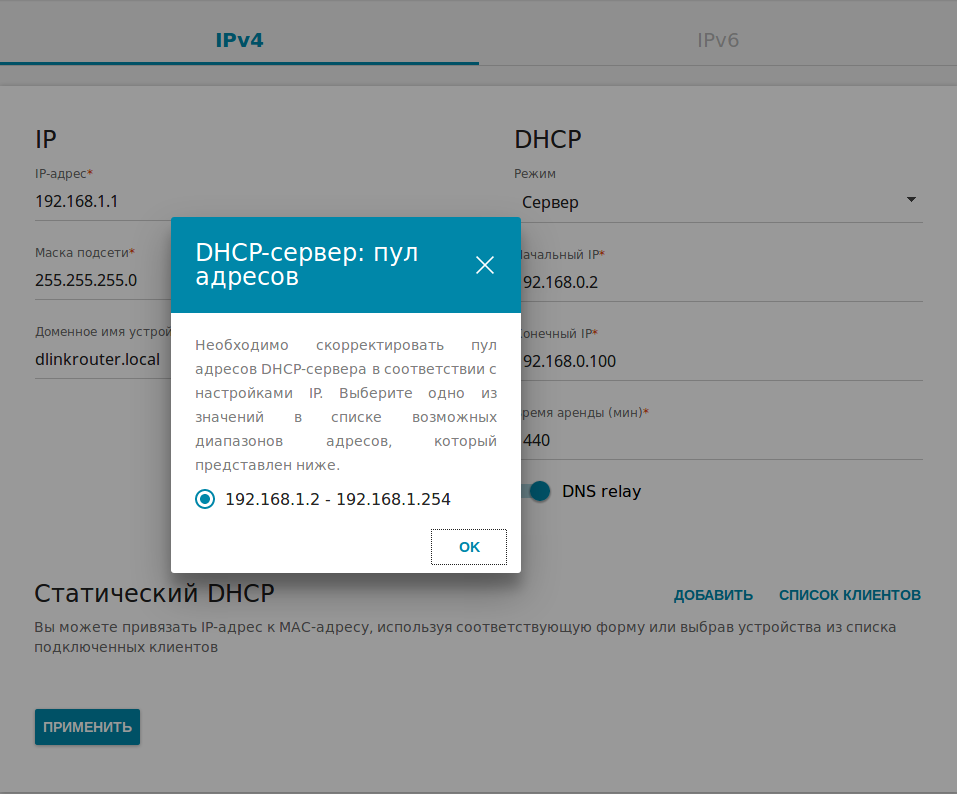 4. После нажатия кнопки Применить будет предложено отредактировать пул DHCP-сервера, т.е. диапазон IP-адресов, из которого назначаются IP-адреса пользователям, подключенным к маршрутизатору. Нажмите кнопку ОК.