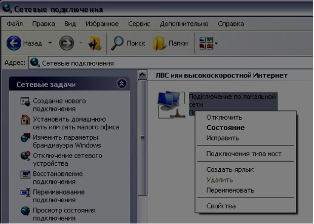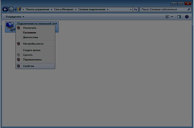 2. В окне Сетевые подключения щелкните правой кнопкой мыши по соответствующему Подключению по локальной сети и выберите строку Свойства в появившемся контекстном меню.