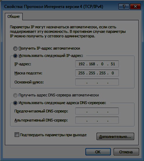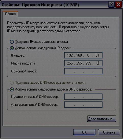4. Установите переключатель в положение Использовать следующий адрес и введите значение 198.168.0.51 в поле IP-адрес. Поле Маска подсети заполнится автоматически. Нажмите кнопку OK.